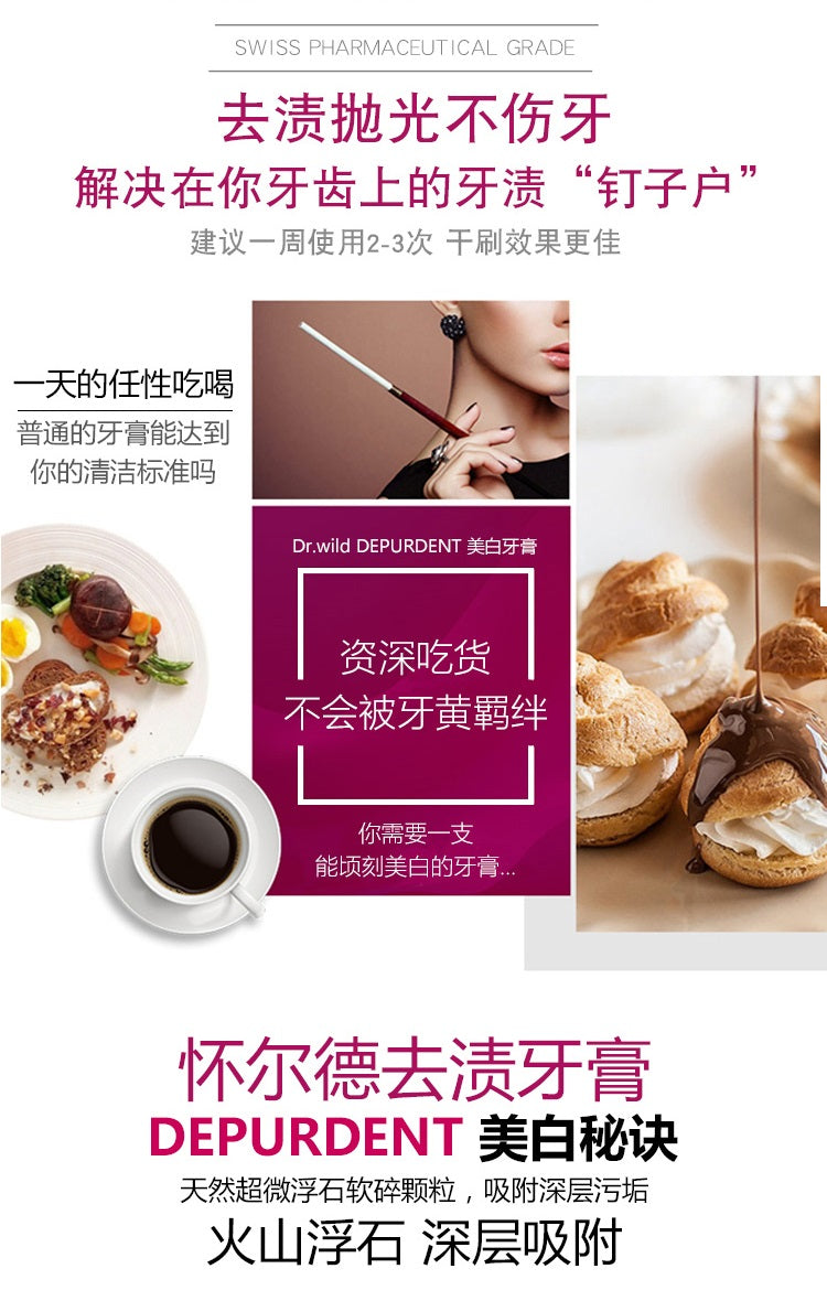 主页 产品推荐 【包邮包税】瑞士Dr.wild怀尔德DEPURDENT抛光去烟渍美白鹌鹑蛋牙膏 50ml