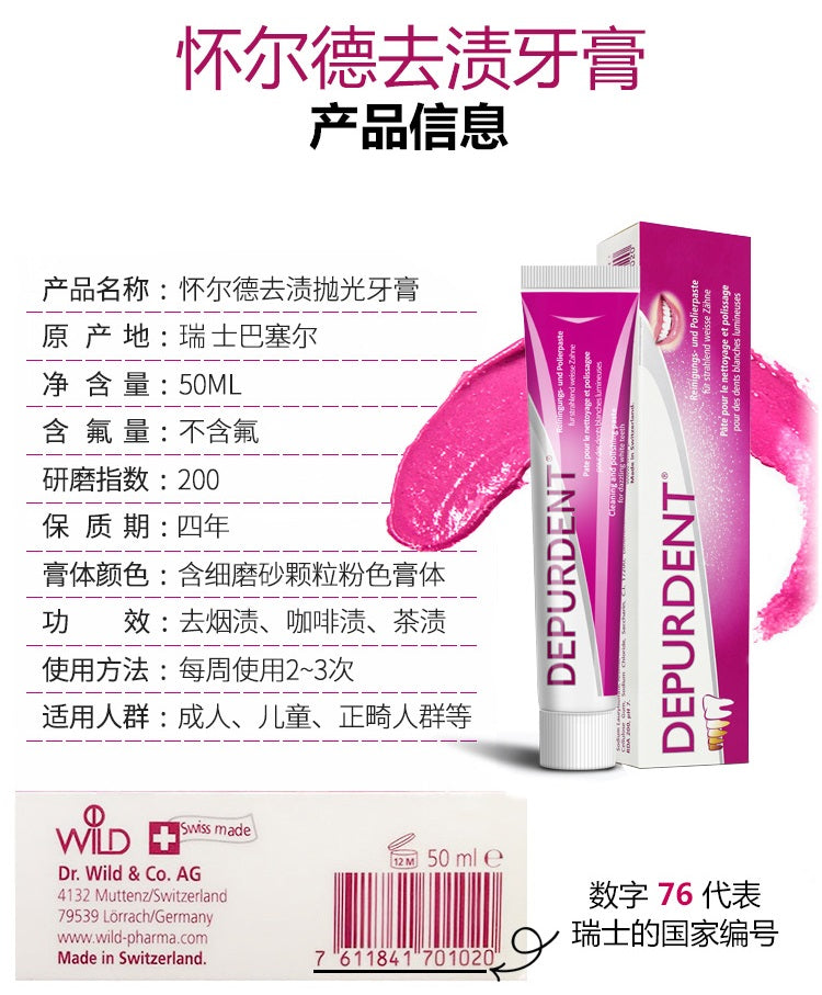 【包邮包税】瑞士Dr.wild怀尔德DEPURDENT抛光去烟渍美白鹌鹑蛋牙膏 50ml