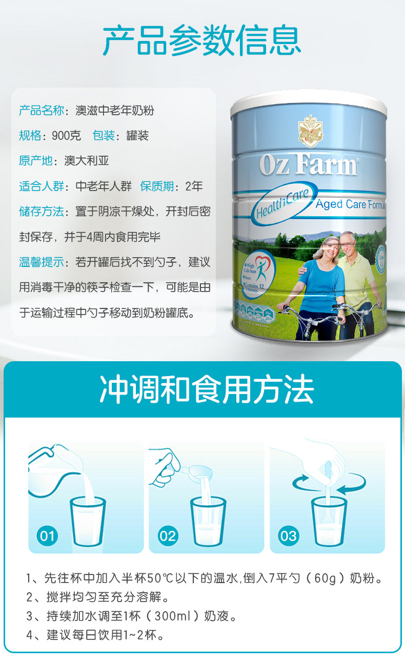 【包邮包税】澳洲Oz Farm澳美滋中老年人奶粉补高钙无蔗糖成人营养早餐奶 900g