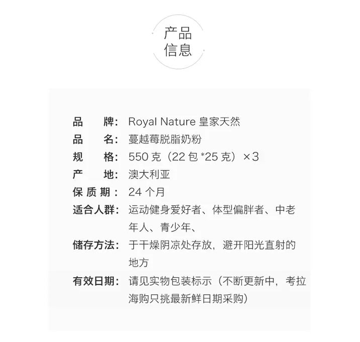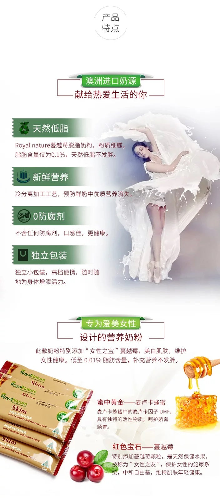 主页 成人奶粉 【现货包邮】澳洲Royal Nature皇家天然蔓越莓成人青少年 脱脂牛奶粉 22条*25g/550g