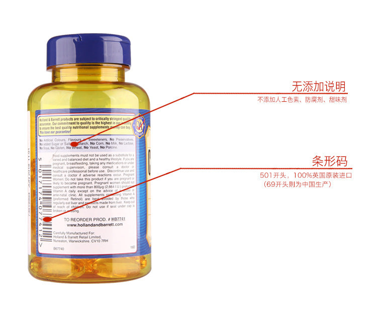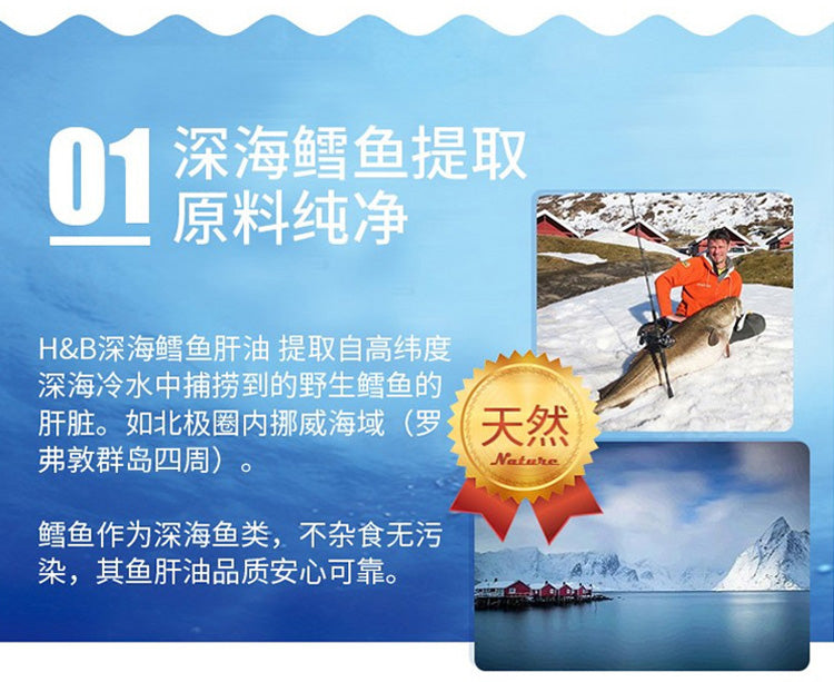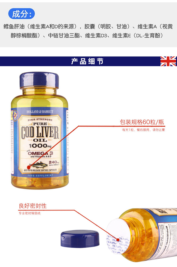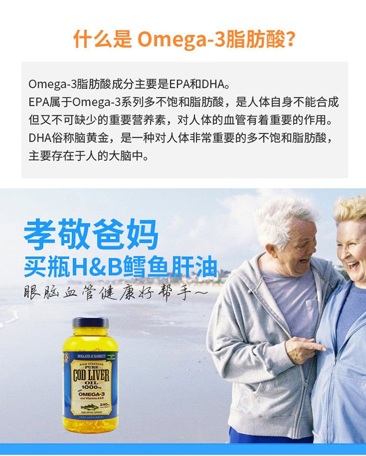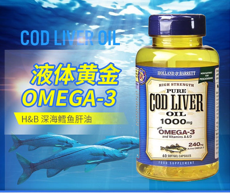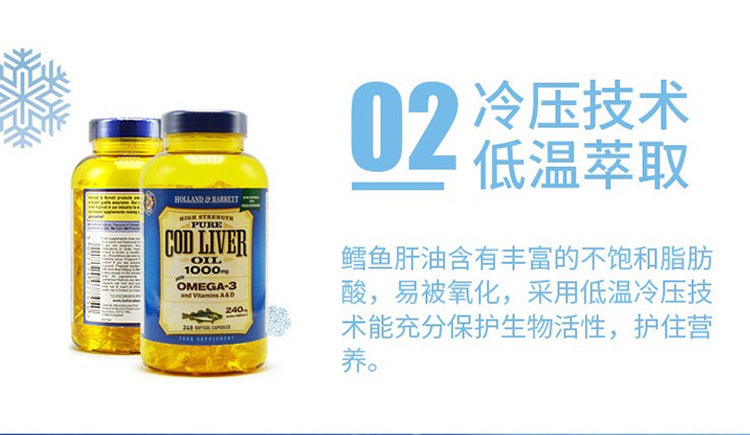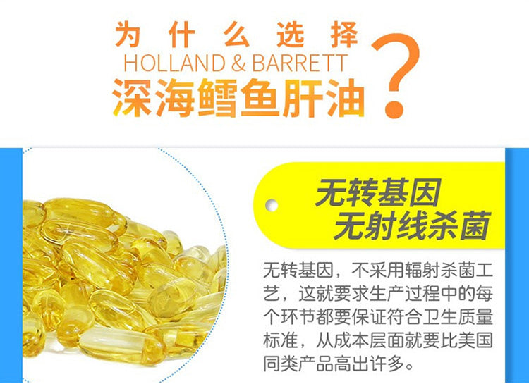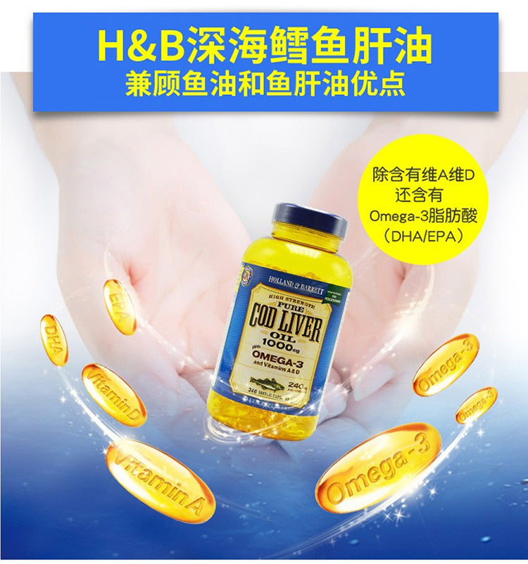 【包邮包税】荷柏瑞(Holland & Barrett)深海鳕鱼鱼肝油软胶囊 明目护眼益智补脑提高记忆力增加强记忆力 Omega-3 1000mg 240粒