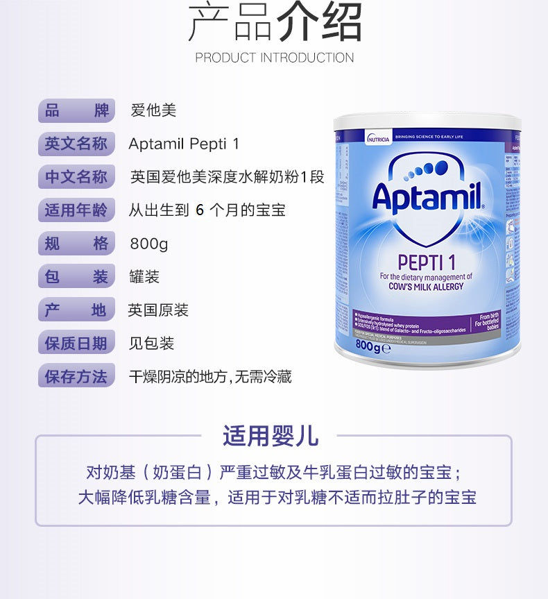 【包邮包税】英国版Aptamil爱他美深度水解奶粉PEPTI 1段(0-6月)800g