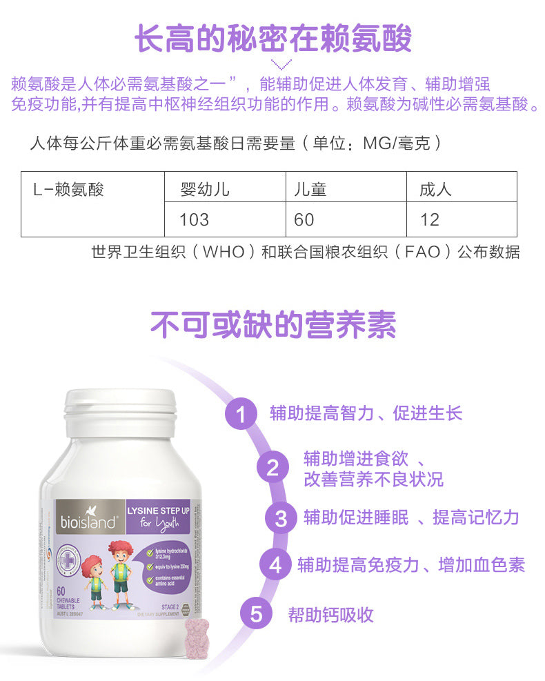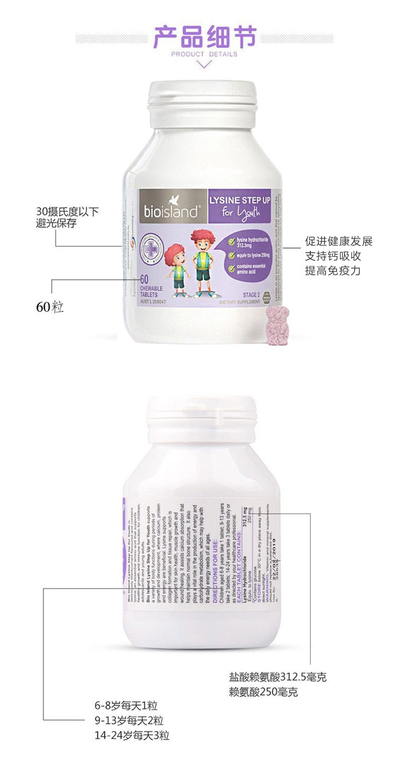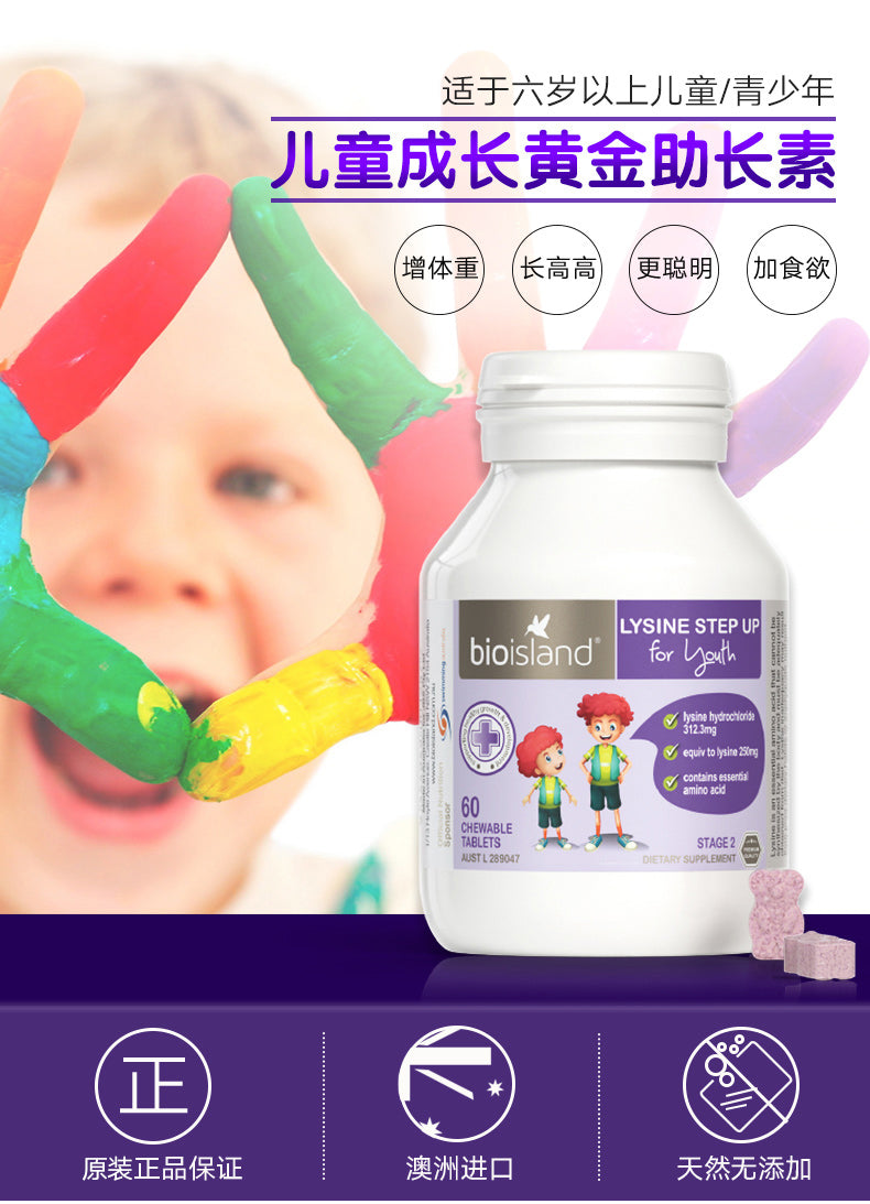 【包邮包税】澳洲Bioisland儿童青少年黄金赖氨酸助长素2段 60粒