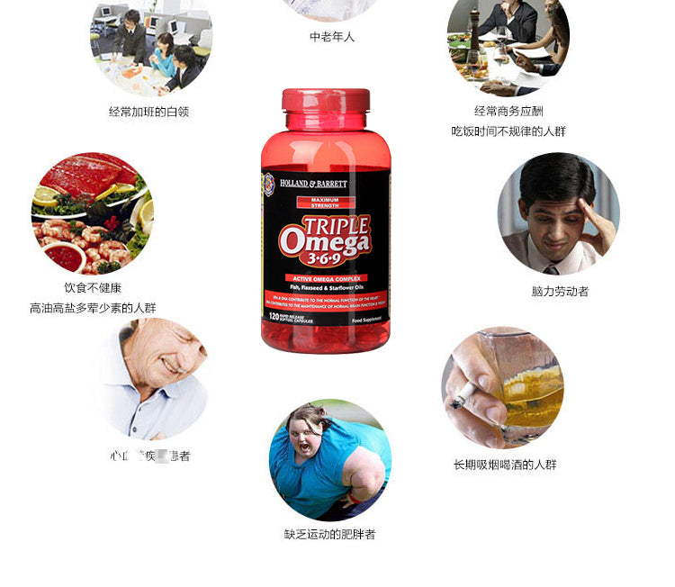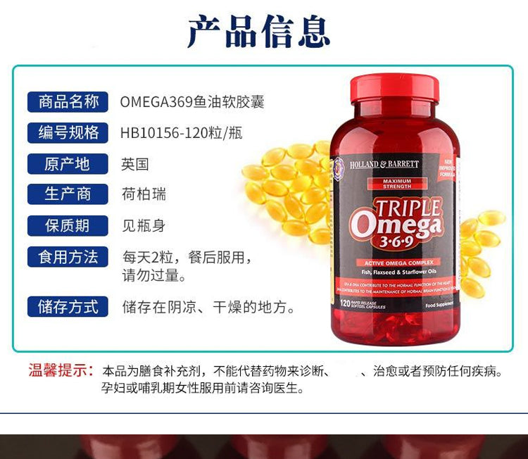 【包邮包税】荷柏瑞(Holland & Barrett)TRIPLE Omega369三倍加强深海鱼油软胶囊亚麻籽星花油深海鱼油369 120粒