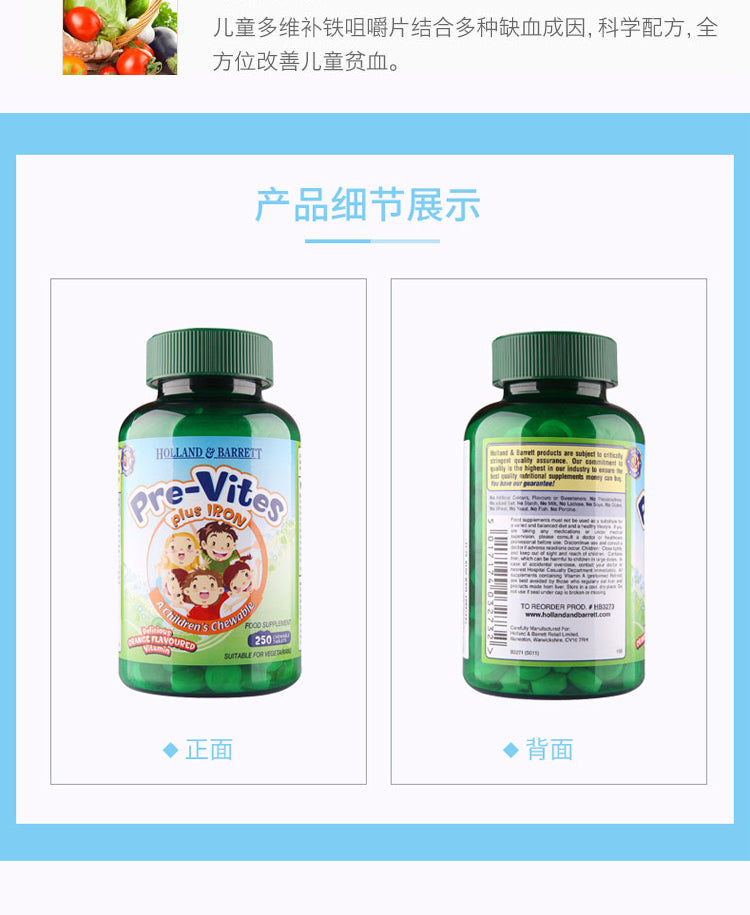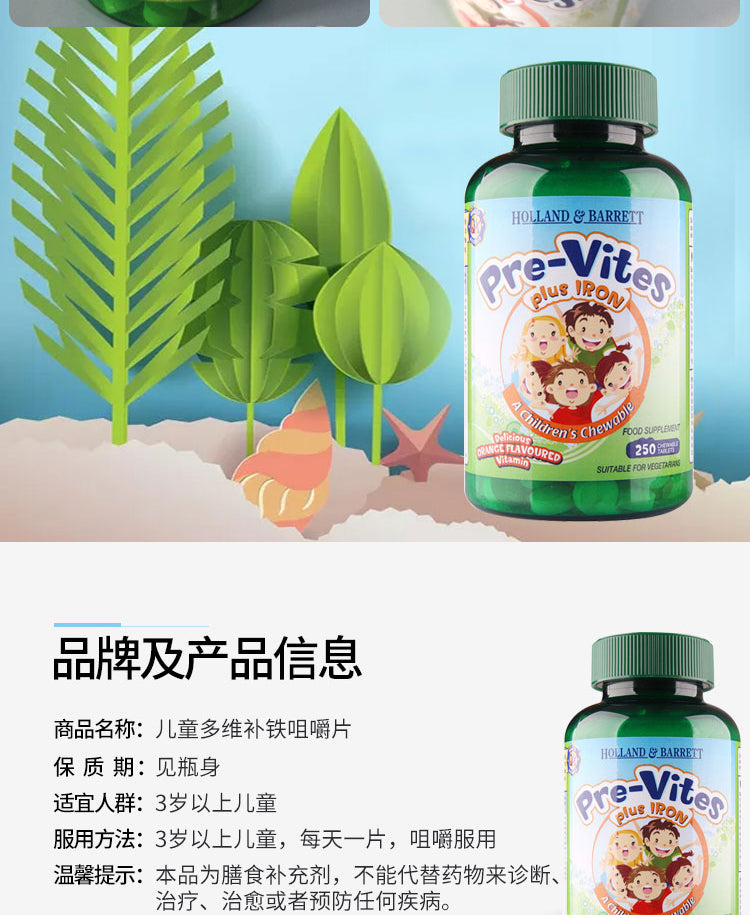 【包邮包税】荷柏瑞(Holland&Barrett)Pre-Vites儿童(3岁+)维生素多维含铁咀嚼片 250粒