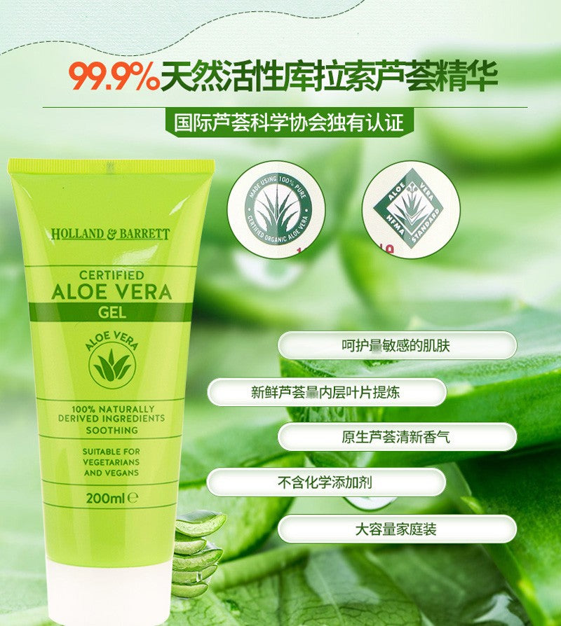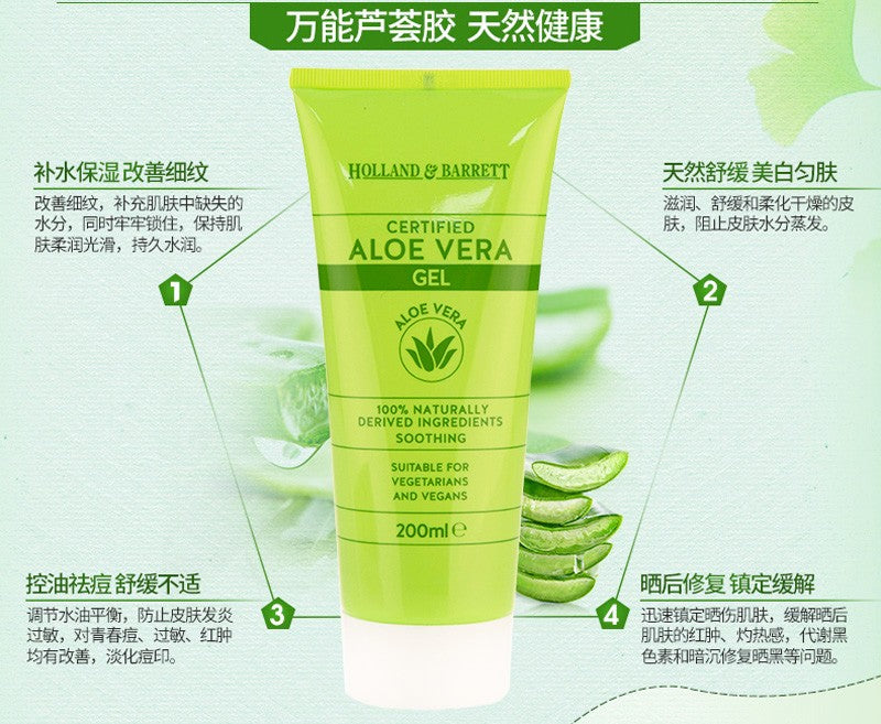 Holland&Barrett芦荟胶,采用天然的成份及好品质的芦荟,保持有效的活性成份高达99.9%,可舒缓肌肤、补水保湿、抑制痘痘、淡化痘印、修复晒后肌肤等。另外,本品即使敏感肌肤也可使用。晒后修复, 舒缓镇定肌肤 ,淡化痘印 ,锁水保湿 ,纯天然无添加, 缓解肌肤干痒。