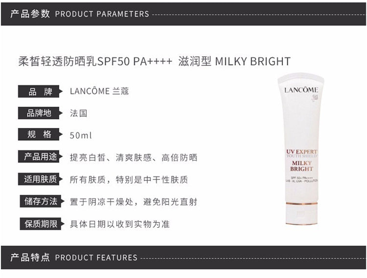 【包邮包税】LANCOME兰蔻MILKY BRIGHT新柔皙轻透防晒乳 滋润版 50ml