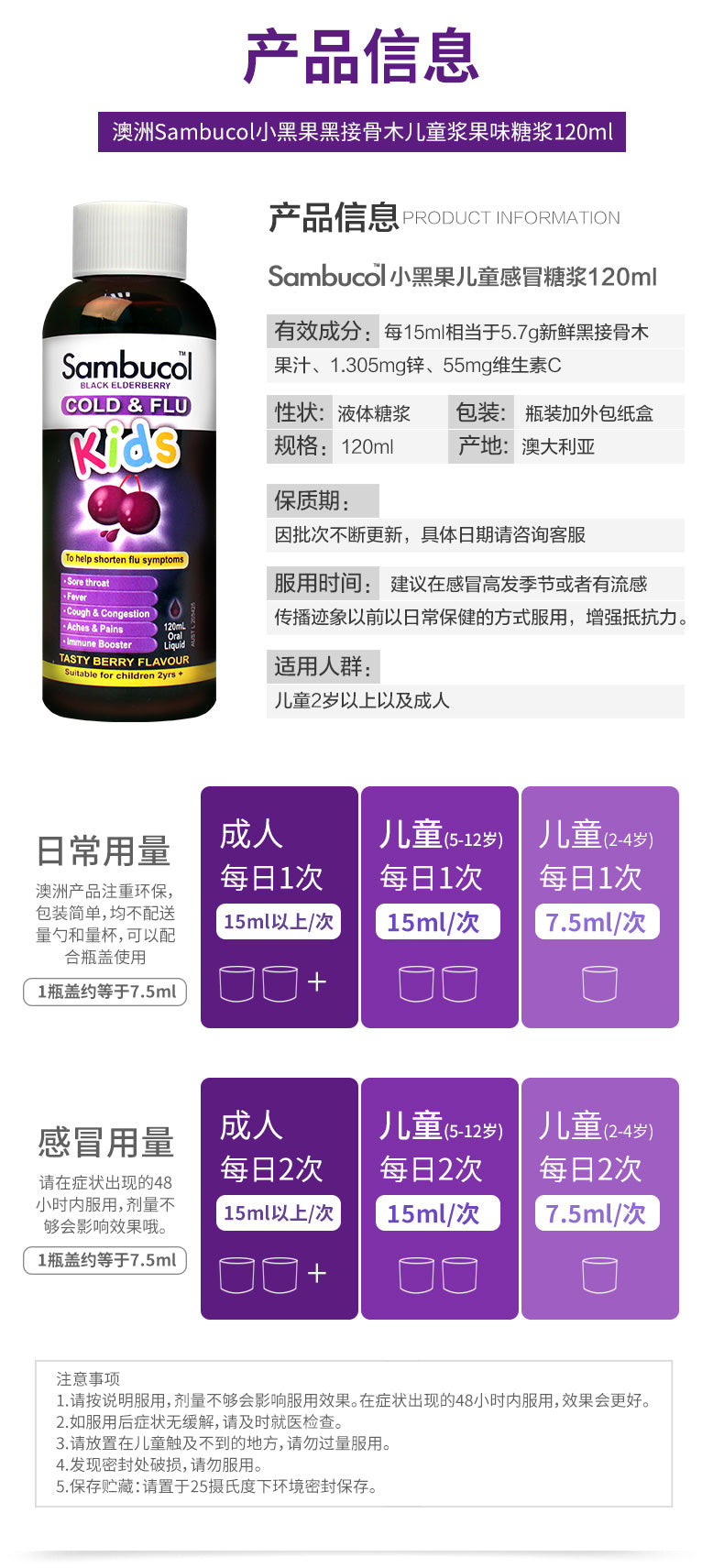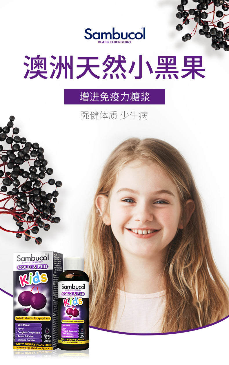 | 品名: | 澳洲Sambucol小黑果黑接骨木莓儿童补充VC维生素C补锌营养液糖浆120ML |
