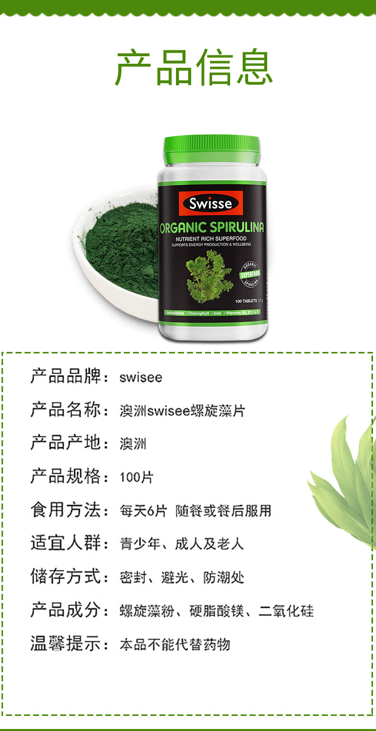 主页 Swisse/斯维诗 【包邮包税】澳洲Swisse ORGANIC SPIRULINA有机天然高浓度螺旋藻片 100片