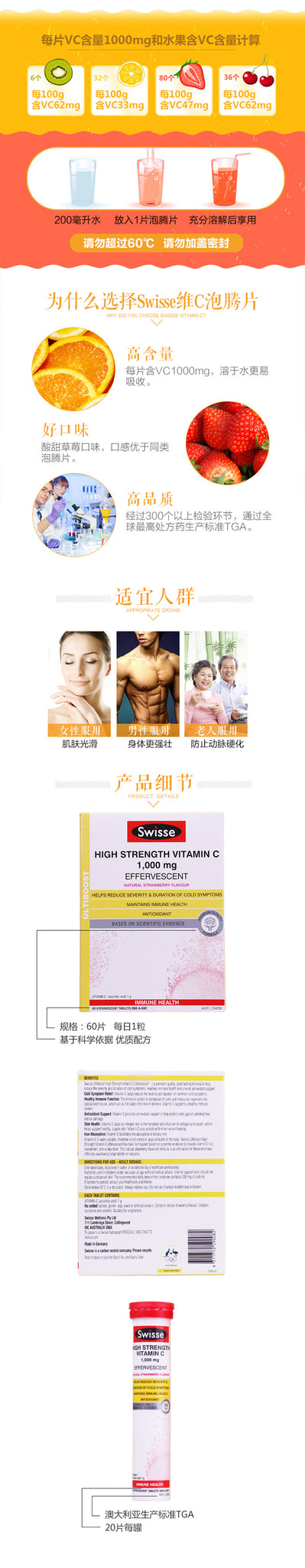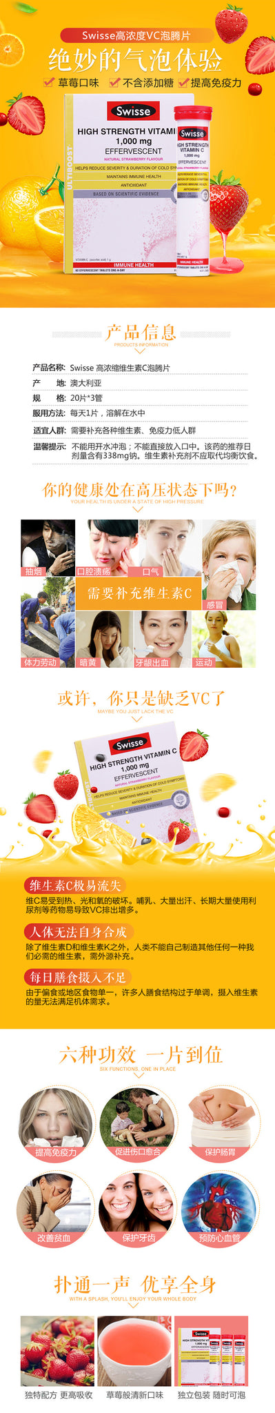 【包邮包税】澳州Swisse HIGH STRENGTH VITAMIN C浓缩维生素C泡腾片 20片*3管