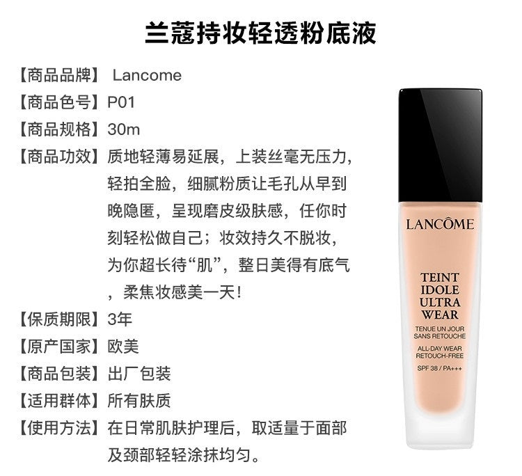 【包邮包税】LANCOME兰蔻TEINT IDOLE ULTRA WEAR持妆轻透粉底液 P-01#陶瓷白 30ml