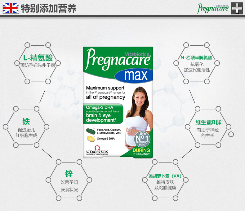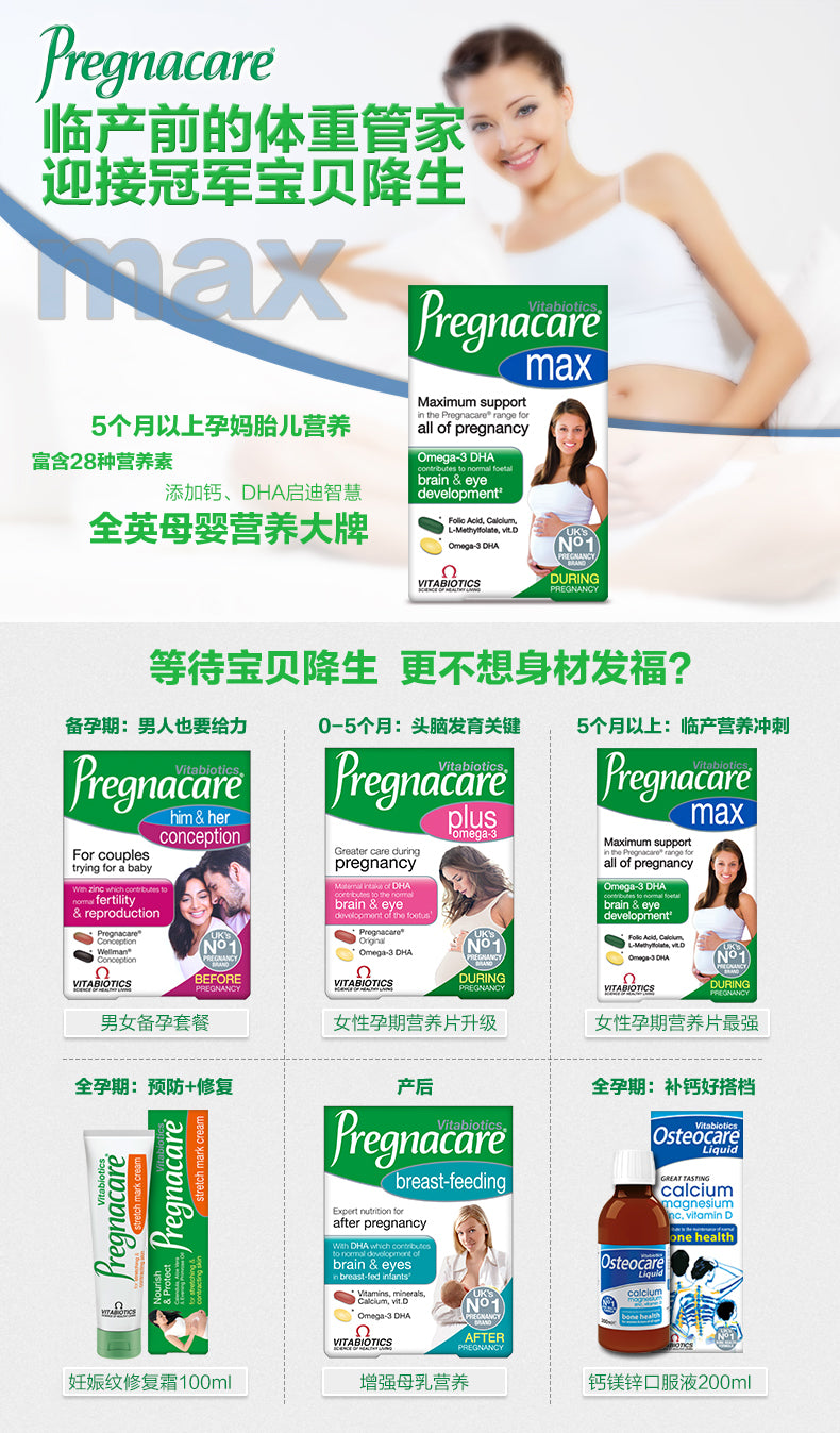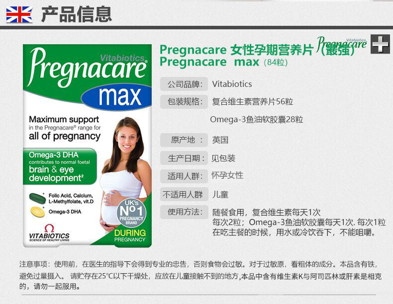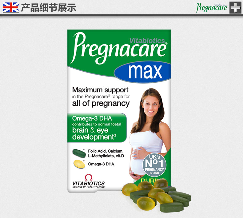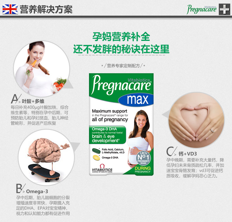 【现货包邮】Vitabiotics 薇塔贝尔pregnacare孕妇dha鱼油孕期营养补钙催乳催奶孕早中后期预产期叶酸复合维生素 最强版MAX 56粒
