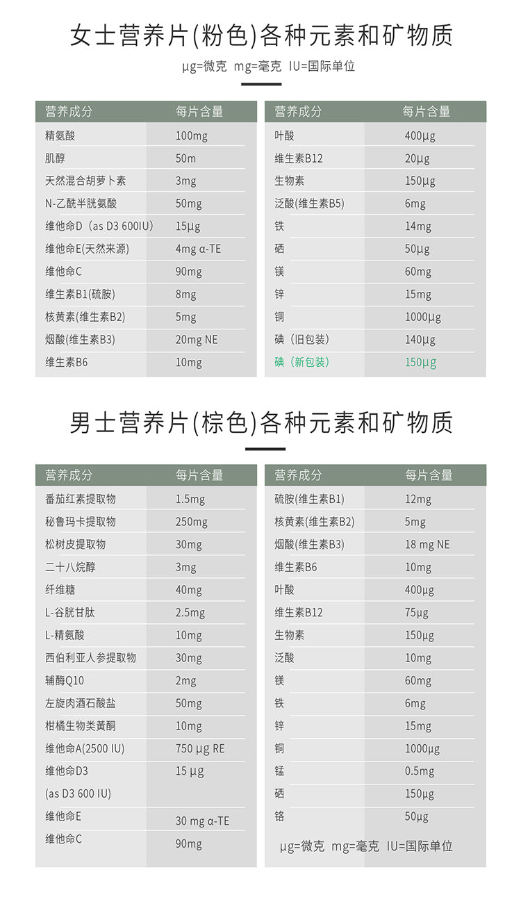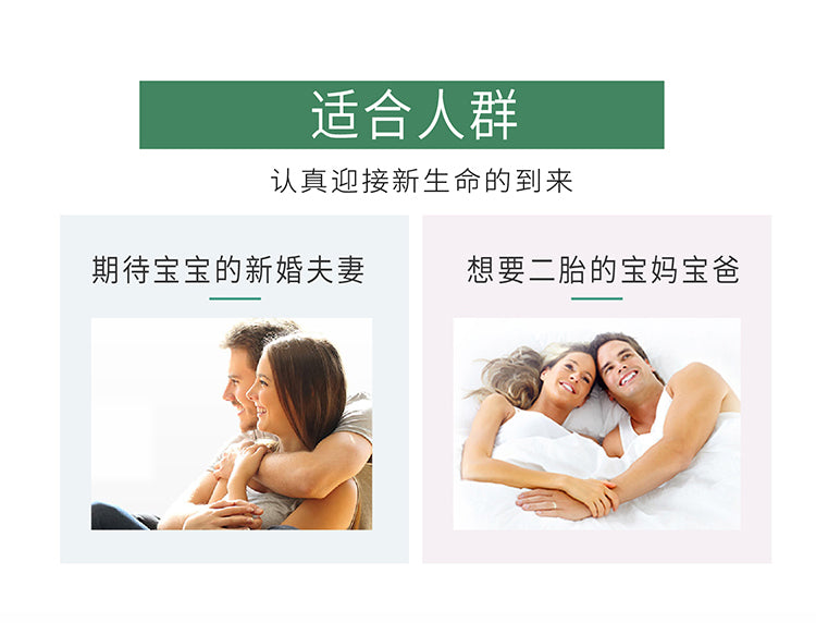 两种营养片,男性备孕片有助于男性保持生殖健康、调节荷尔蒙;女性备孕片有助于提前调整生理状态,补充身体怀孕期间所需的营养。男女双方,各司其职,调节双方身体健康状态,为迎接新生命做更加全面、完善的准备。