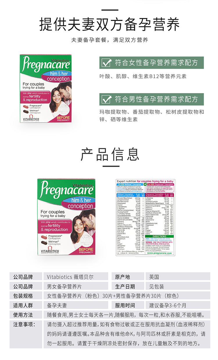 Pregnacare男女孕前备孕营养片包含针对男女设计的
