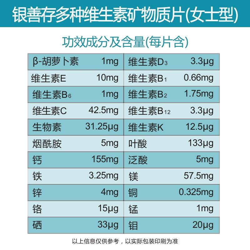 | 品名: | 【品牌直供】银善存女多种维生素矿物质片0.92g/片*160片/盒专为中老年女士补充营养 |
