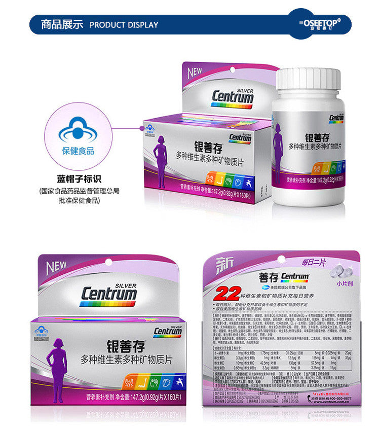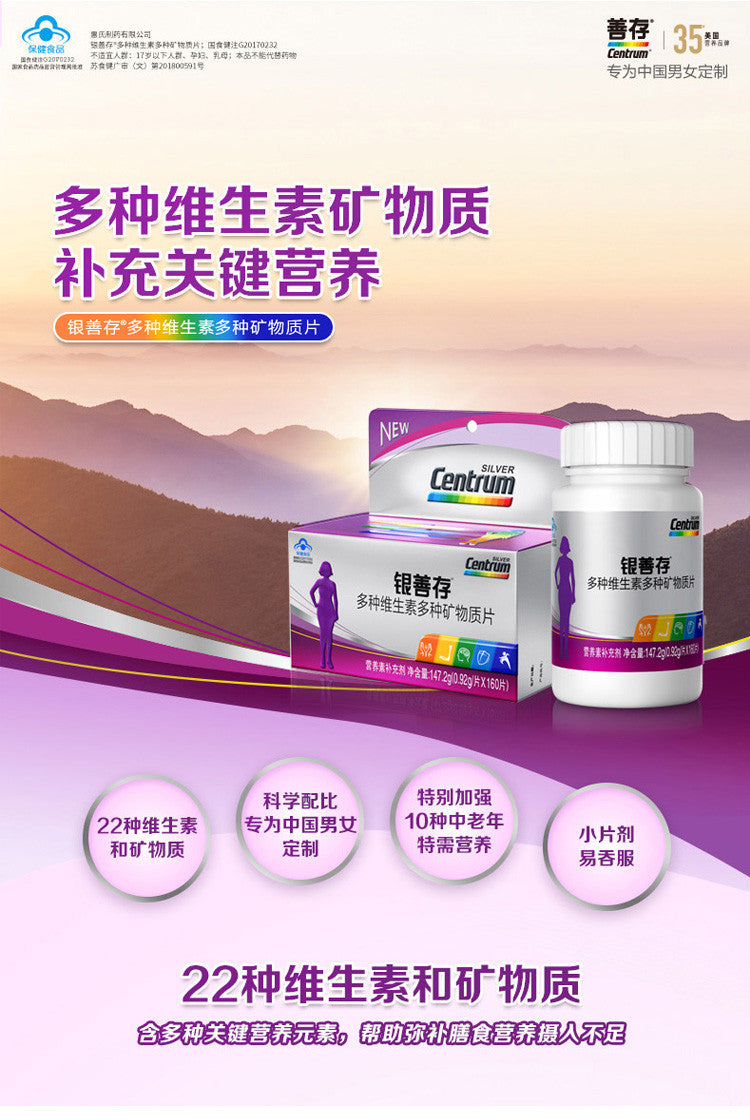 | 品名: | 善存(Centrum)银善存维生素多种矿物质片1.7g*160片中老年女士 瓶装 |
