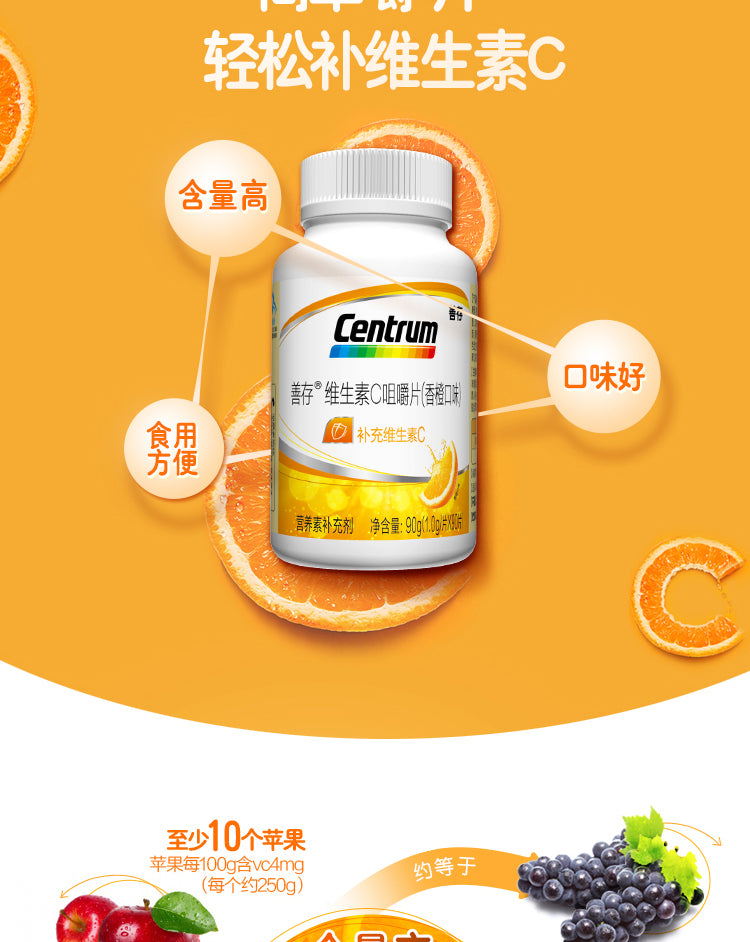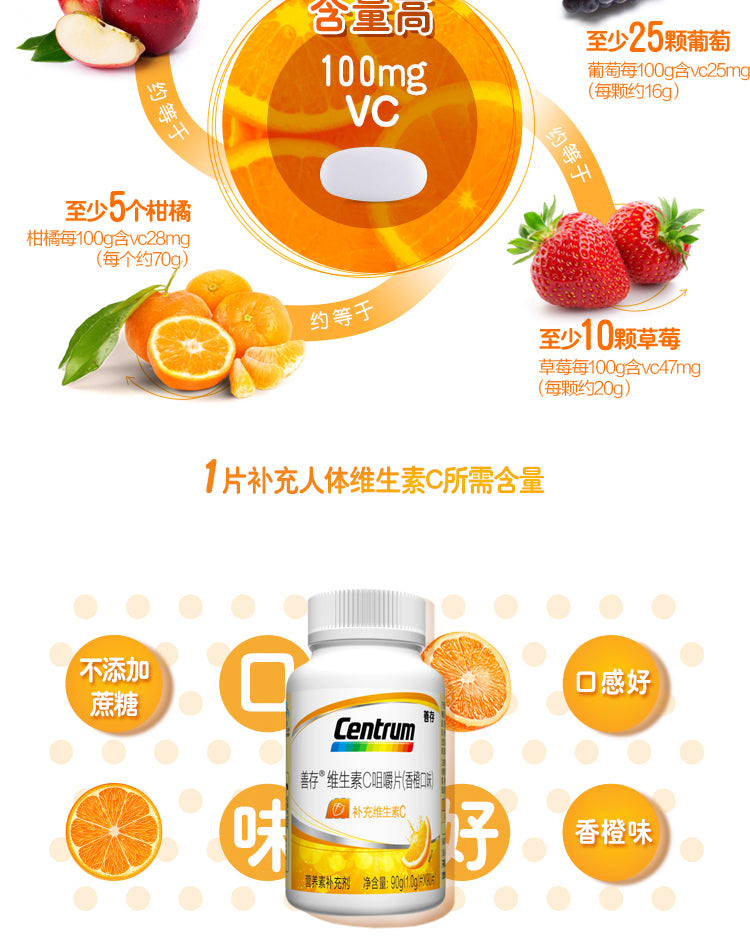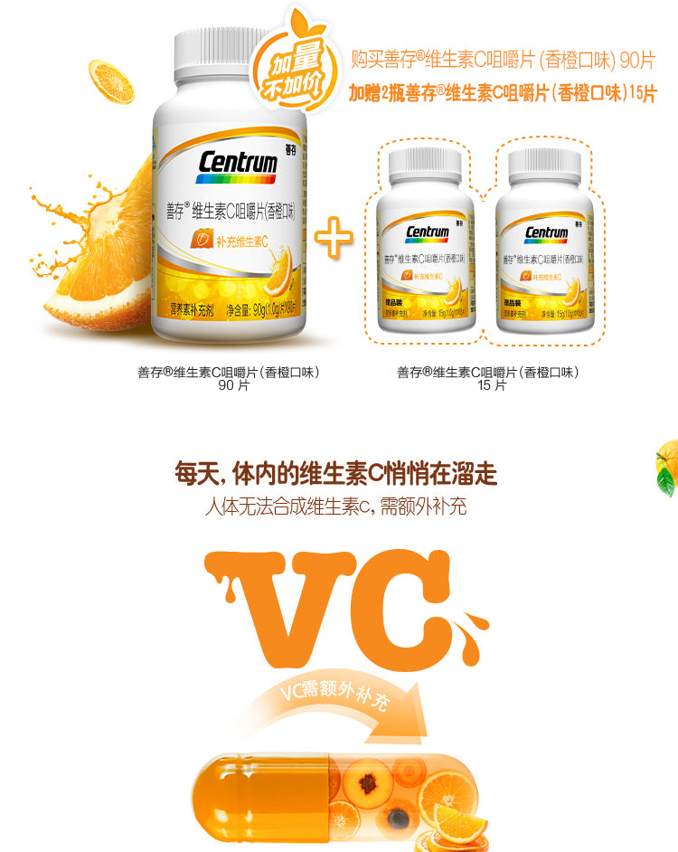 | 品名: | 美国善存R维生素C咀嚼片(香橙口味)90片+15片*2瓶 |